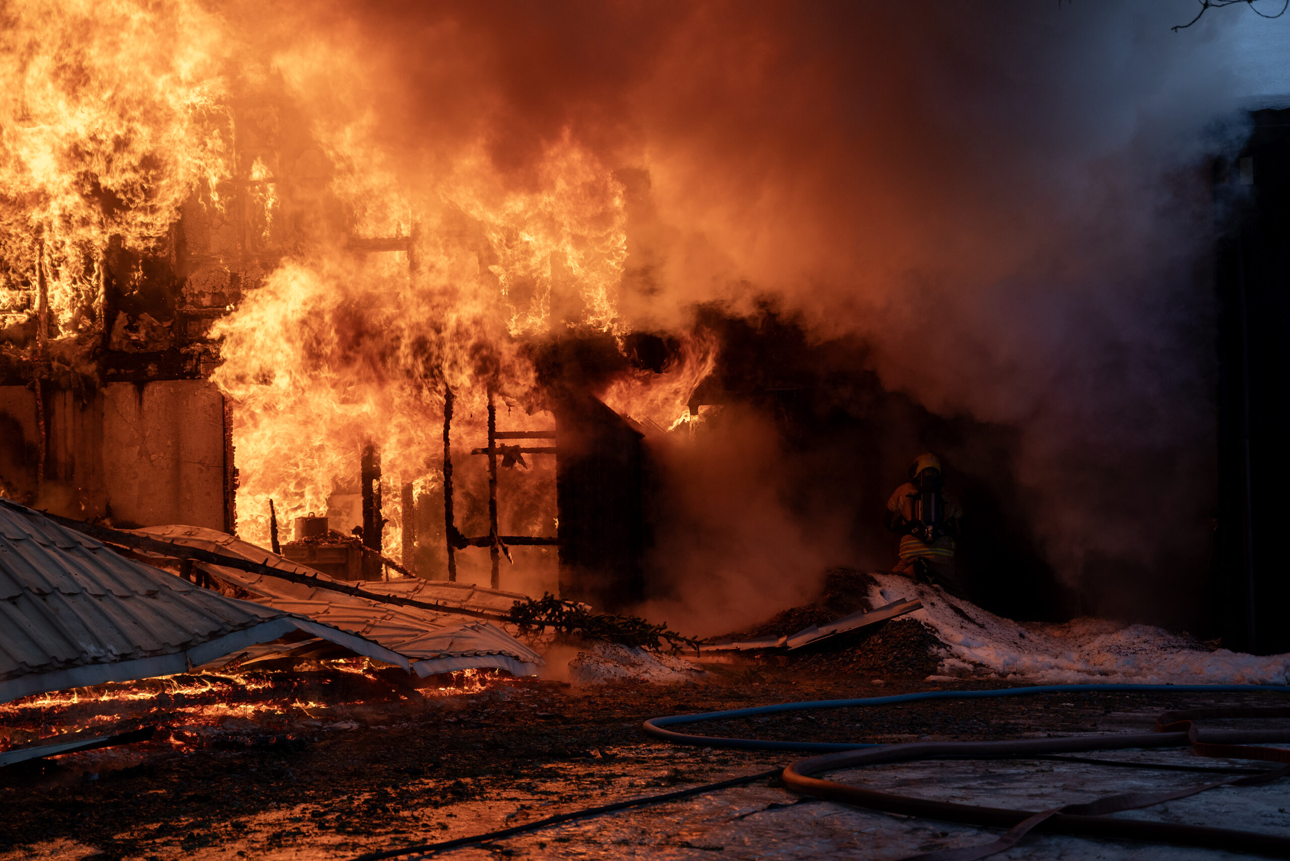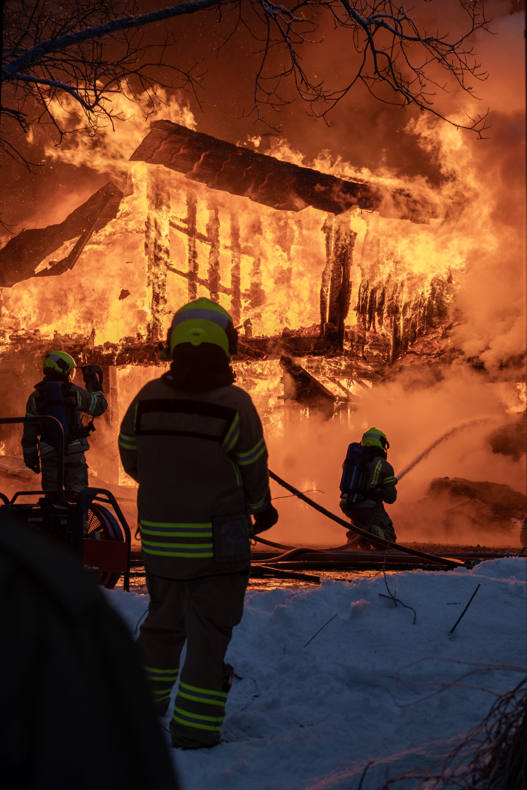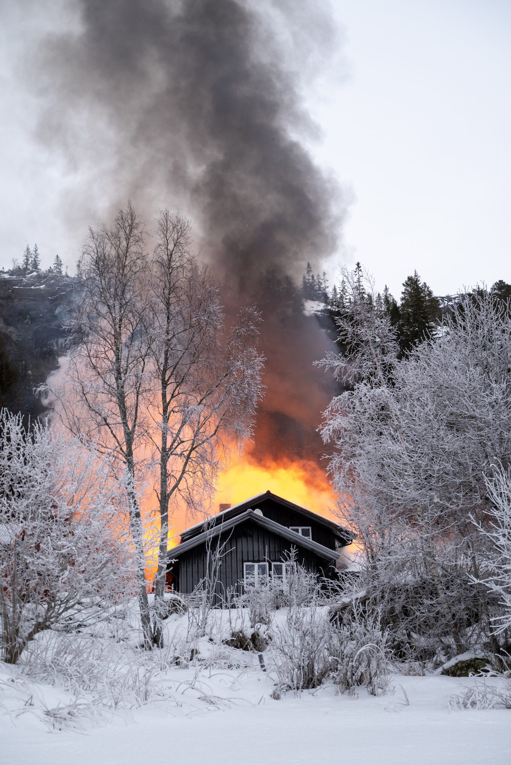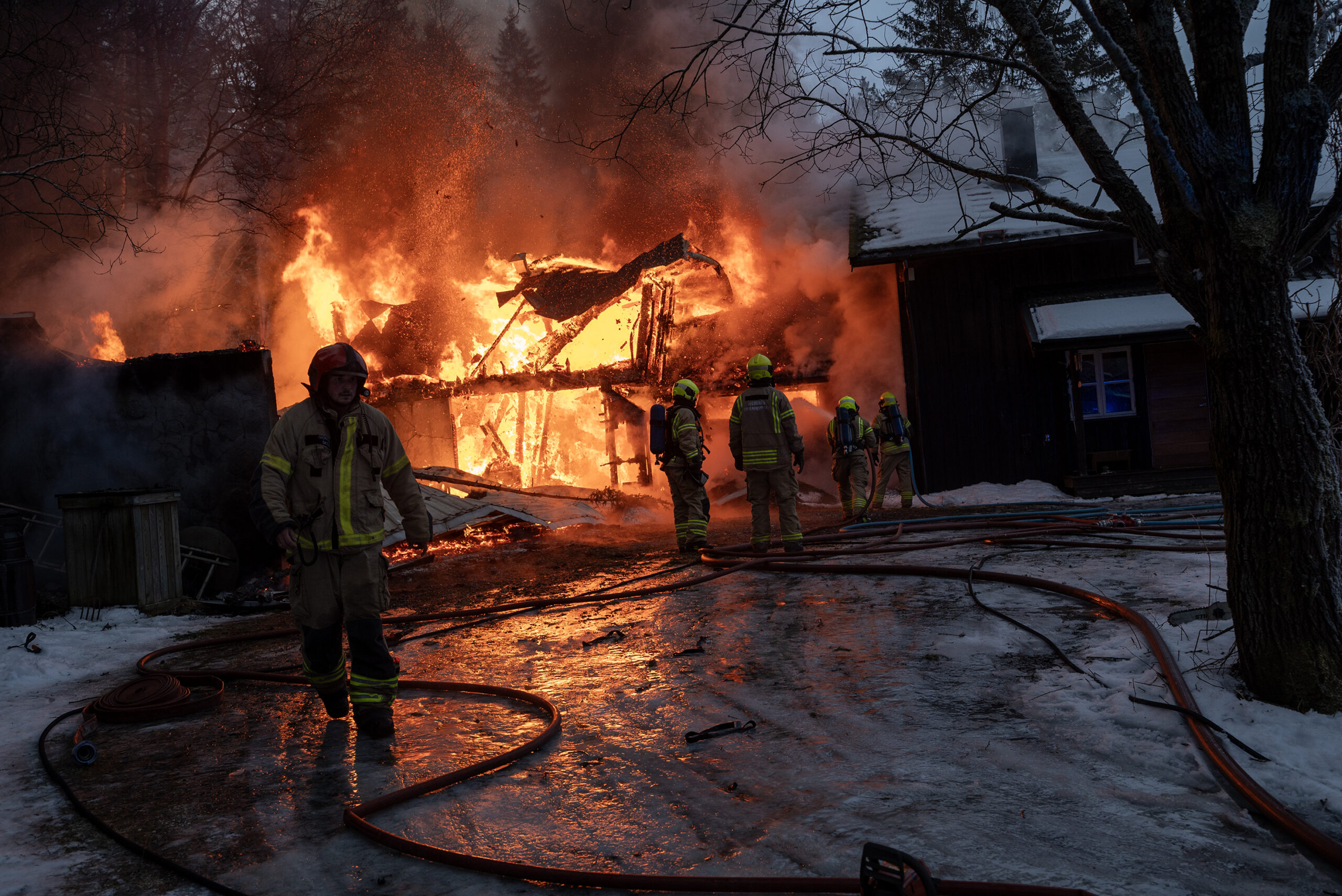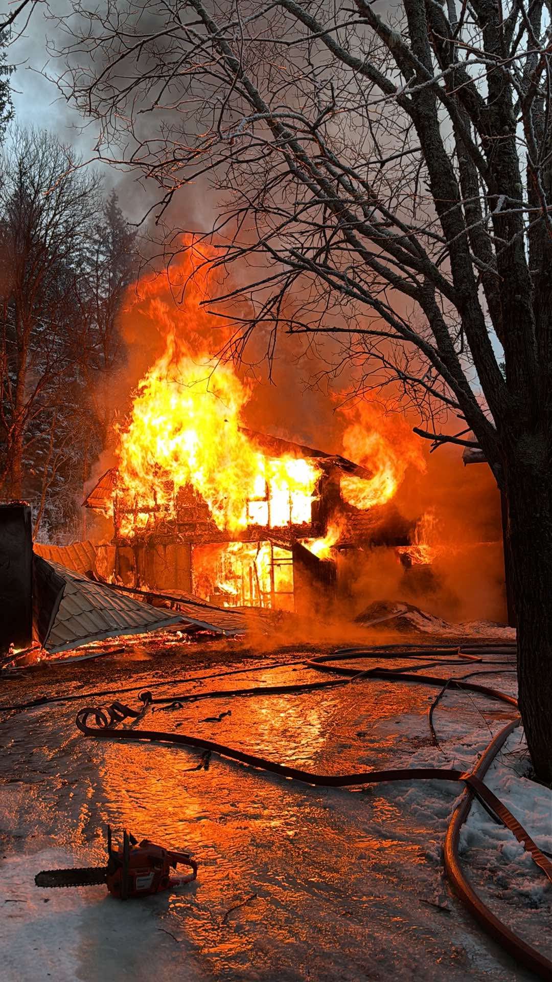 Oppdatert klokken 14:39: Journalist på stedet, Rune Furuhatt, opplyser at innsatsleder i politiet, Alf Espen Eriksen, sier at brannmannskapene prioriterer å berge mest mulig av bolighuset, men at de sliter litt med vanntilførselen.