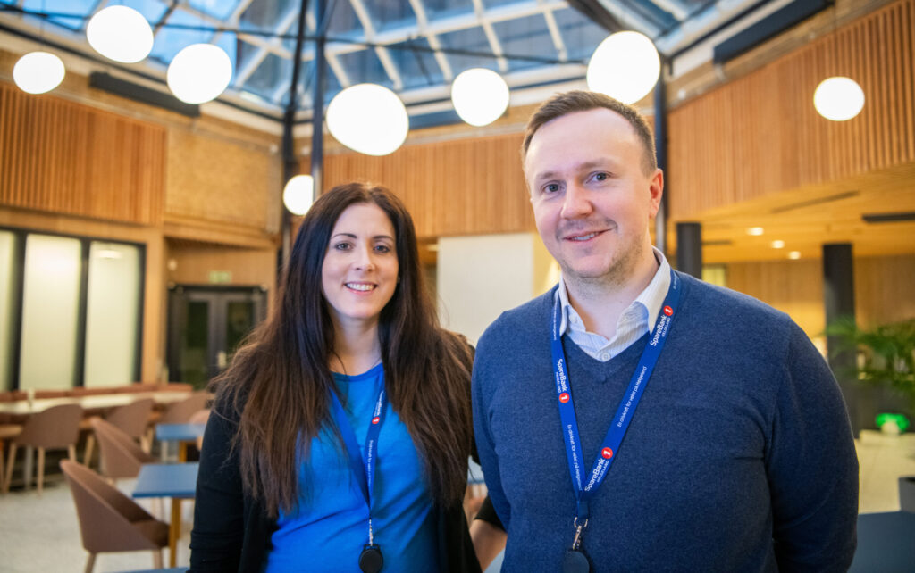 Samspill: – Det handler om tydelige ansvarslinjer, gode rutiner og ikke minst samspill mellom mennesker og teknologi, sier Cecilie Johnsen, direktør for risikostyring og etterlevelse i SpareBank 1 Helgeland. Her sammen med leder økonomisk kriminalitet, Jørgen Nordvang. FOTO: Susann Sivertsen