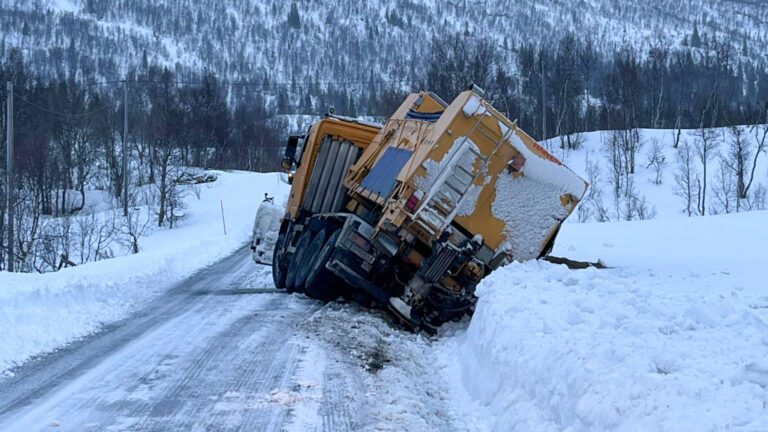 Brøytebil av veien i Røssvassbukta